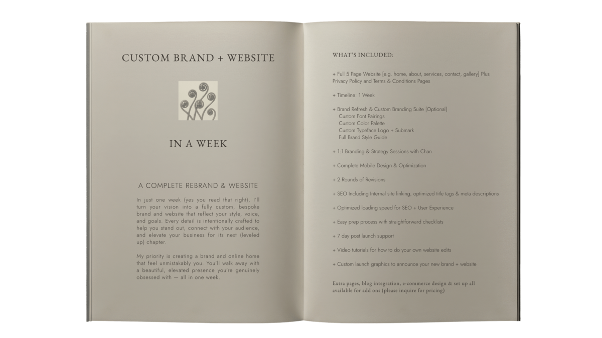 My priority is creating a brand and online home that feel unmistakably you. You’ll walk away with a beautiful, elevated presence you’re genuinely obsessed with — all in one week.